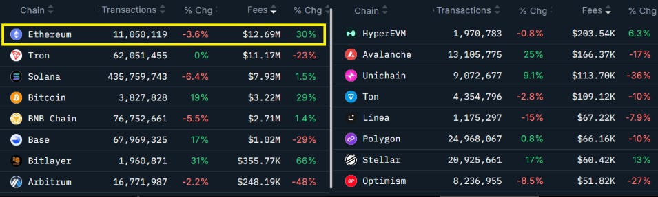 By contrast, Solana fees fell 10% and BNB Chainâs dropped 57%. Ethereum isnât just holding its lead â itâs expanding it.